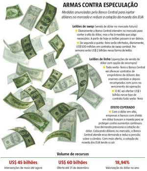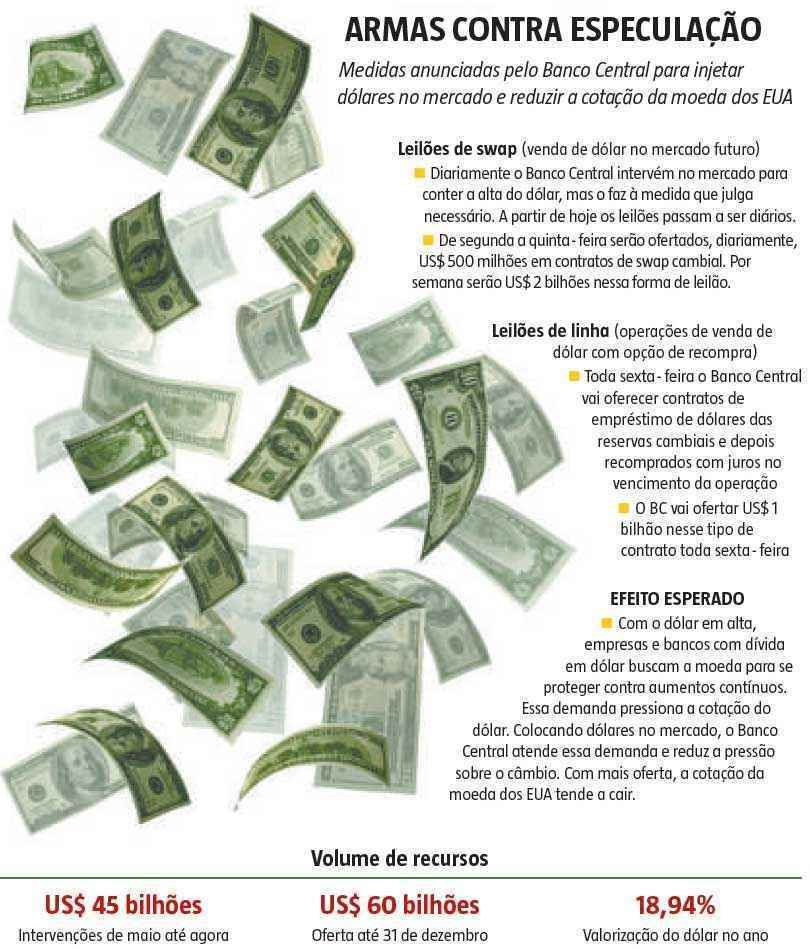 Segundo o BC, de segunda a quinta-feira, serão feitos leilões diários no valor de US$ 500 milhões cada de swap cambial, uma espécie de venda futura de dólares. Às sextas-feiras, a intervenção se dará por meio de leilões de linhas em dólar, com compromisso de recompra, de US$ 1 bilhão. Ao anunciar a intervenção, a autoridade monetária ressaltou que o objetivo é “prover hedge (proteção) cambial aos agentes econômicos e dar liquidez ao mercado”. A última vez que o BC havia jogado tão pesado com o mercado foi em 2008, logo depois do estouro da bolha imobiliária norte-americana. À época, as intervenções somaram US$ 50 bilhões. Antes disso, somente em 2002, quando os investidores empurraram o dólar a R$ 4, temendo a vitória do então candidato petista Luiz Inácio Lula da Silva. Naquele período, as intervenções, de US$ 50 milhões, foram chamadas de “rações diárias”.